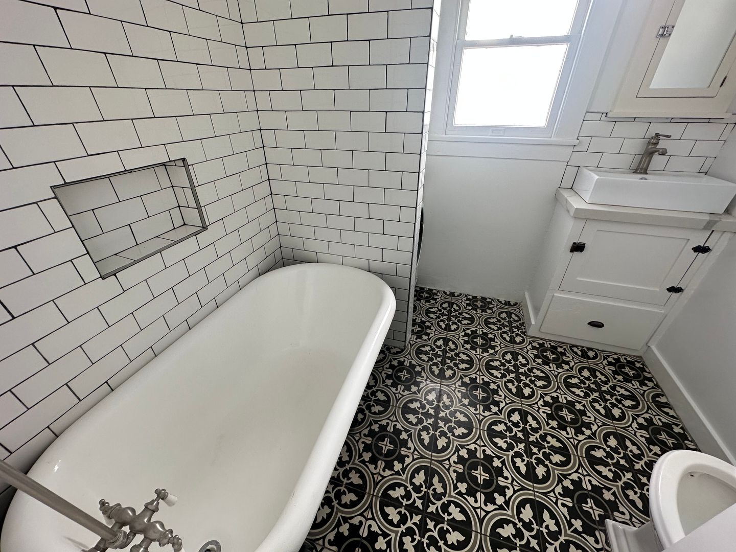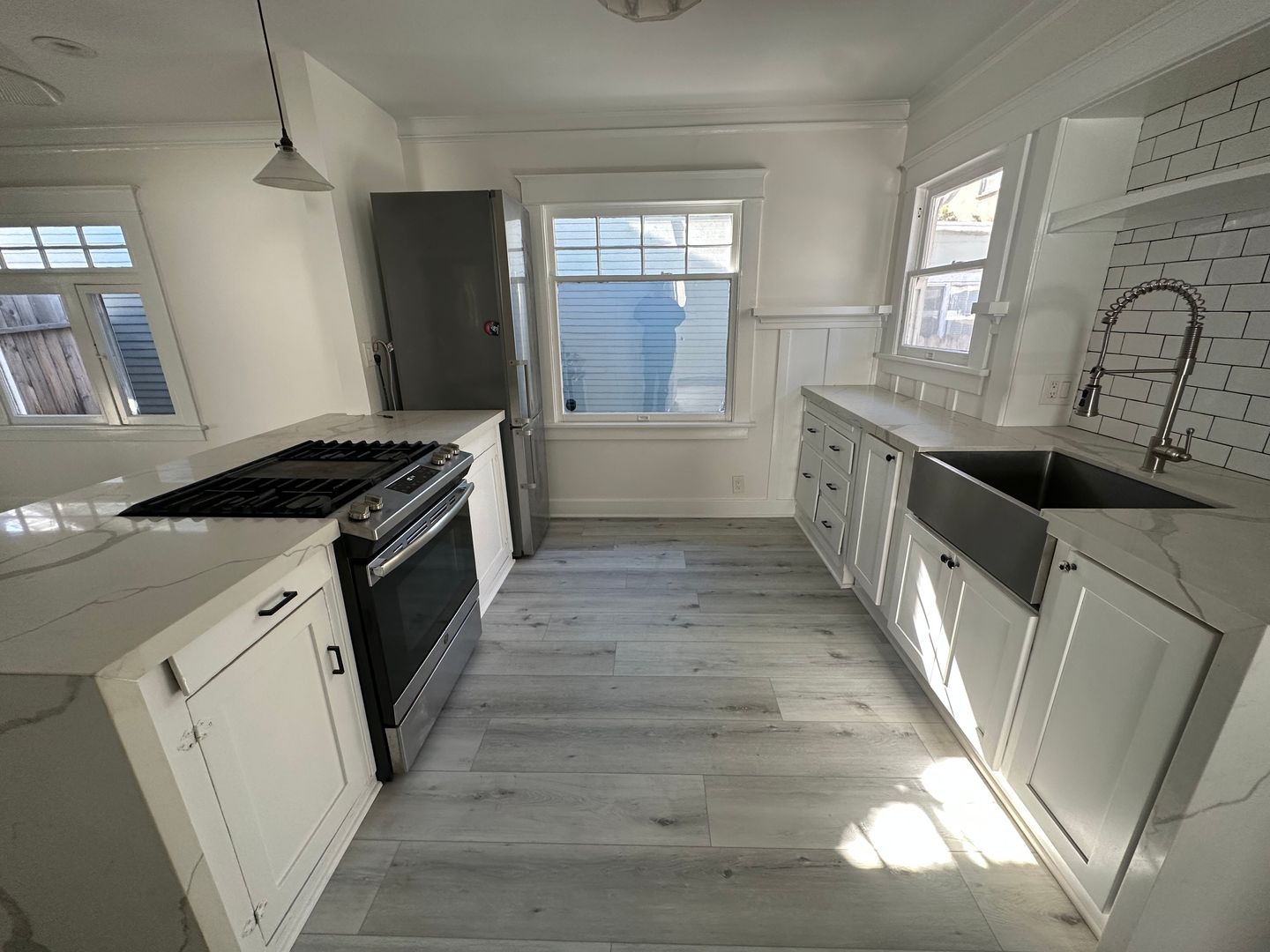 Inside, you’ll find a charming blend of vintage character and modern updates, highlighted by large windows that fill the space with natural light. The open living area features original hardwood floors that flow from the front entry into the kitchen. The kitchen is upgraded with elegant white quartz countertops and stainless steel appliances.
