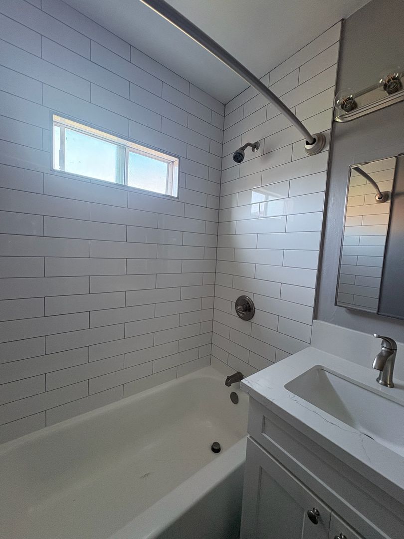 - Stylishly tiled shower and tub
