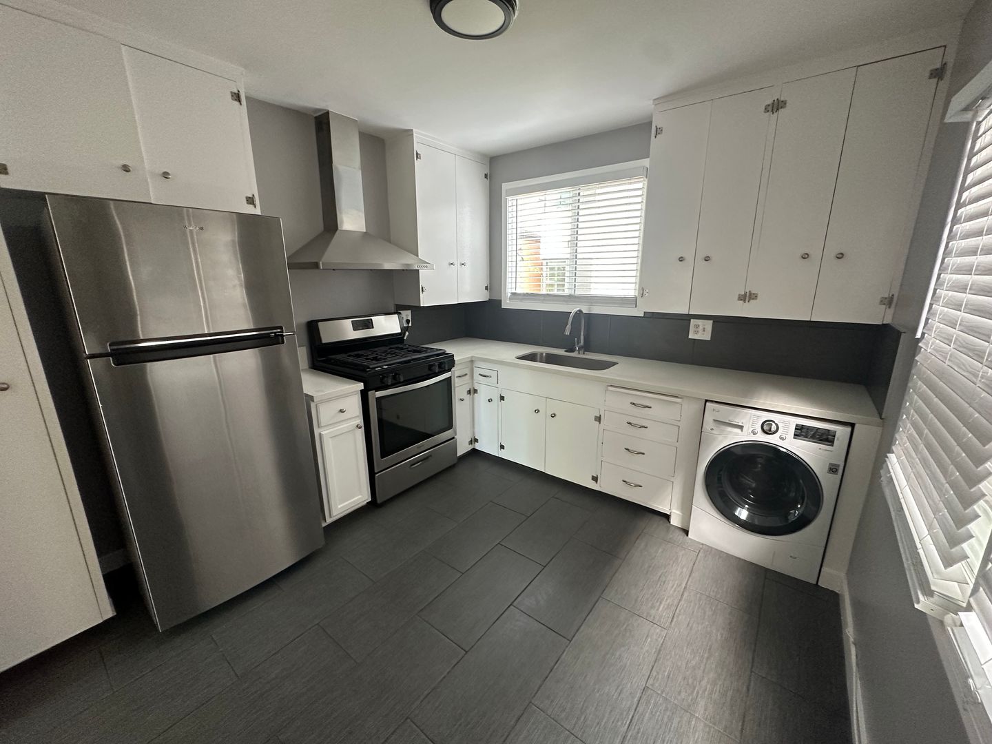 Remodeled kitchen with new tile, quartz countertops, and updated appliances