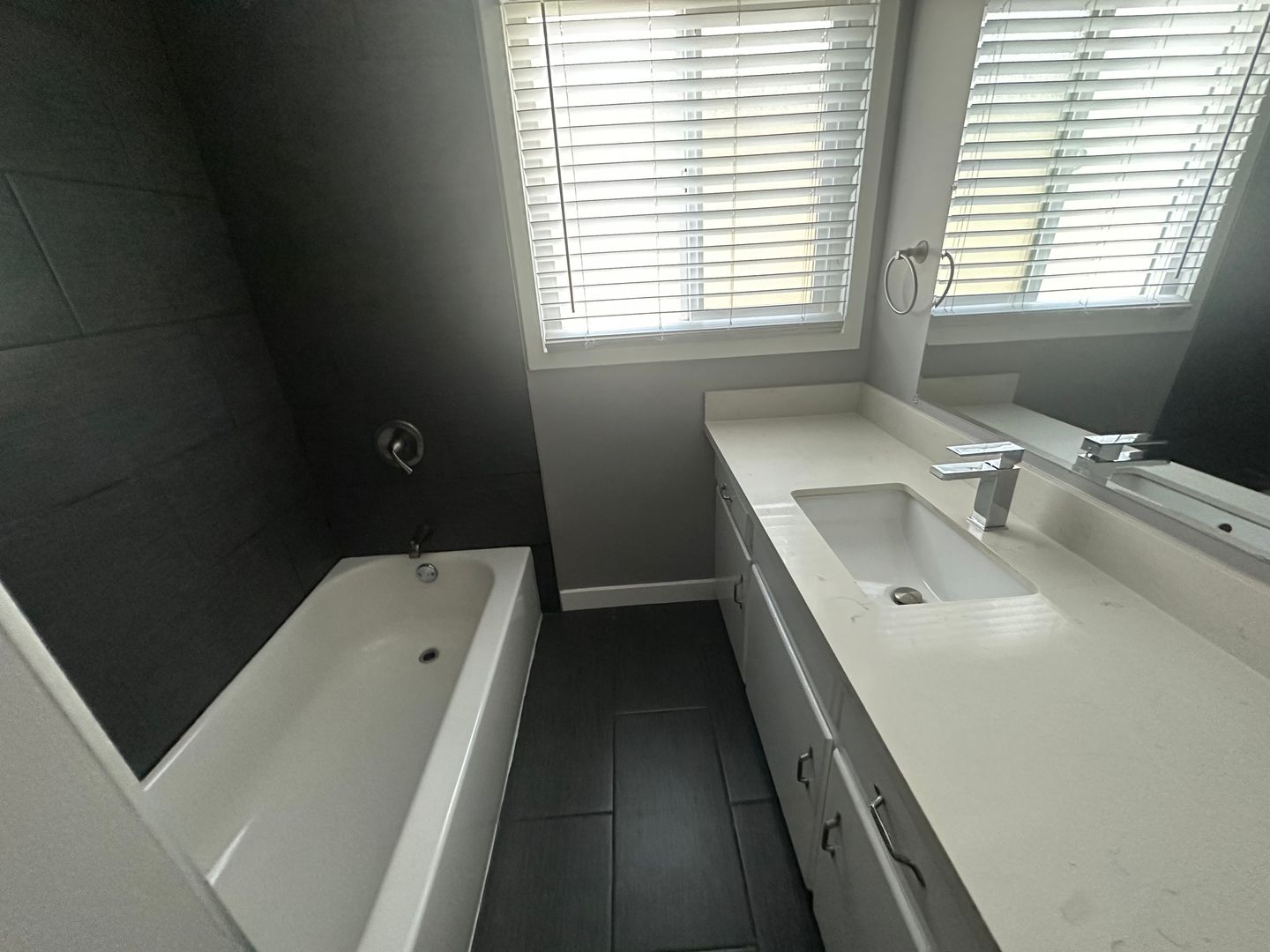 Remodeled bathroom with new tile, tub, and modern finishes